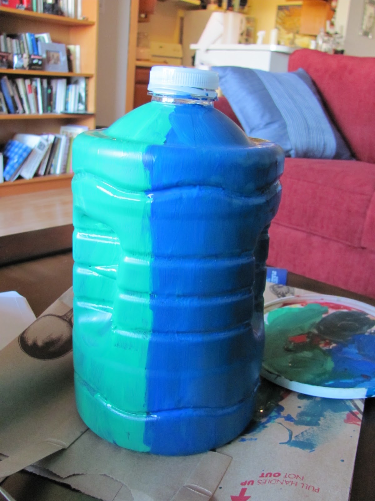My bottle of choice was a 3 liter water bottle- partly because it was 3 liters instead of 2 and partly because I didn't want to drink 2 liters of soda before embarking on my project. I painted it, which is important so that any roots don't get burnt by the sun coming through clear plastic. Then I cut off the bottom.
